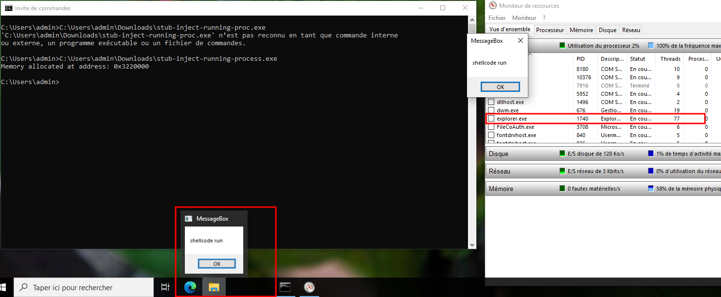 As a result of all of theses operations, we succeed at our final goal, make an already running explorer.exe execute our shellcode, as demonstrated here:
