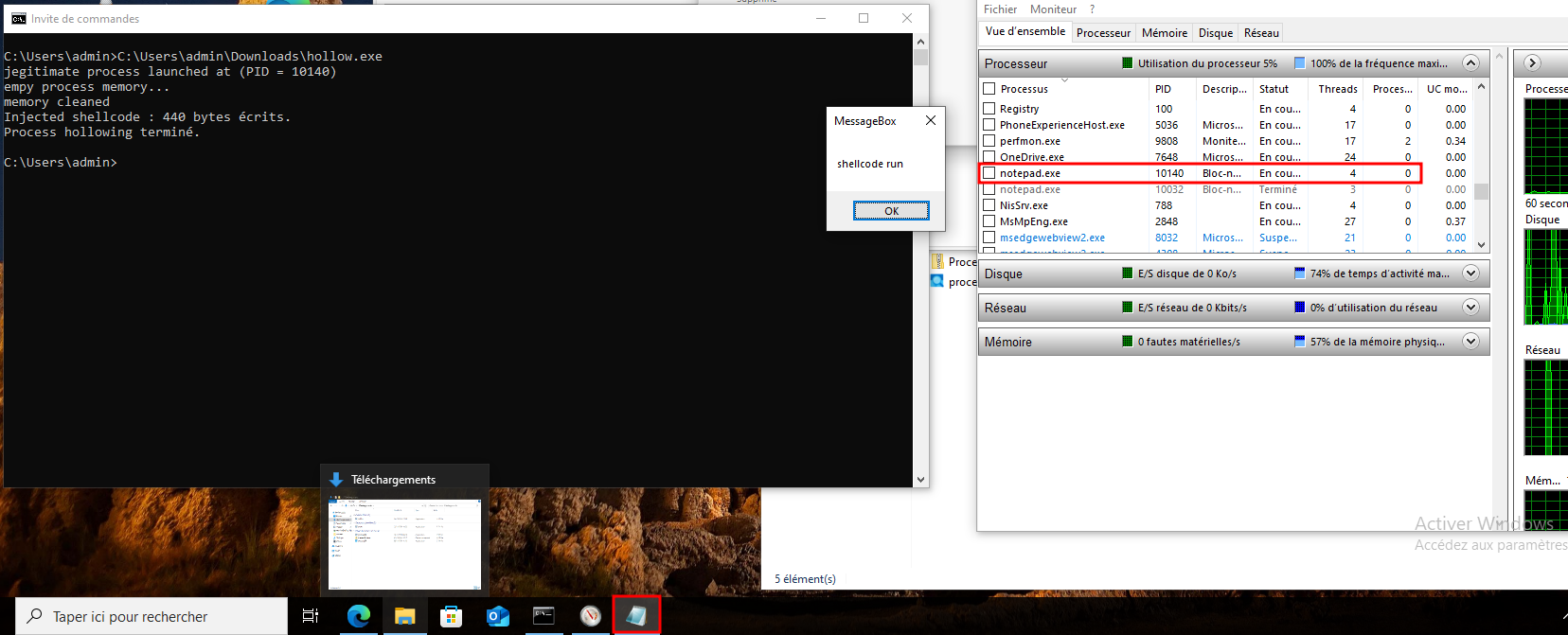 As a result of all of these operations, we have finally achieved our goal: start a notepad.exe program, empty his memory then inject our shellcode into it then and redirect the execution flow of the process without creating a new thread. We succed to create a real skinwalker process !
